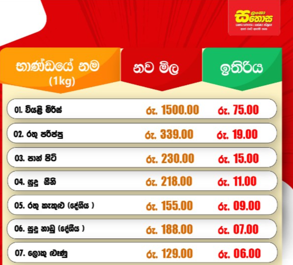 ඒ අනුව වියළි මිරිස්, රතු පරිප්පු, පාන් පිටි, සුදු සීනි, රතු කැකුළු (දේශීය), සුදු නාඩු (දේශීය), ලොකු ලූණු යන භාණ්ඩවල මෙලෙස මිල අඩු කර ඇති බවයි ලංකා සතොස ආයතනය සඳහන් කළේ.