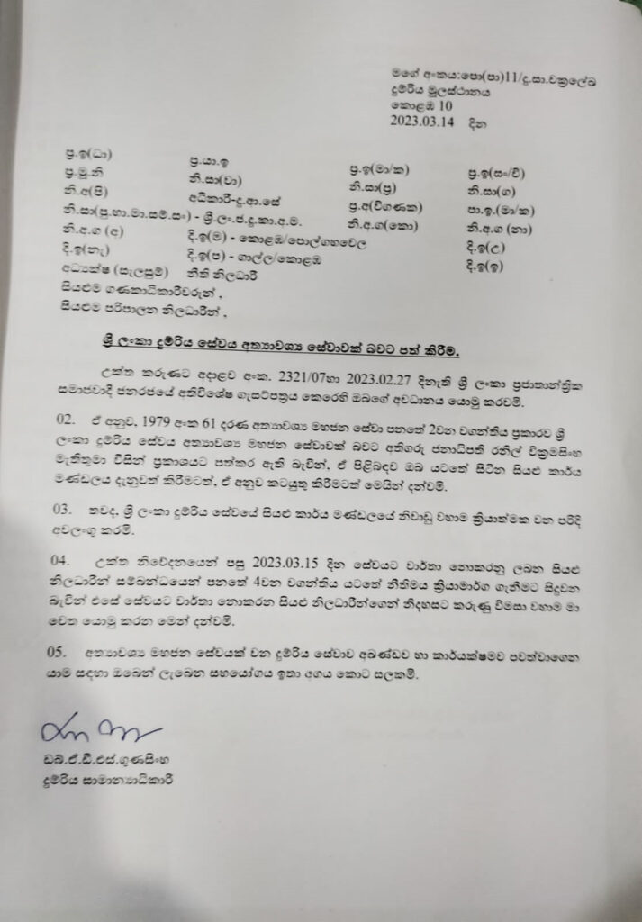 “හෙට දිනයේදි 23/03/15 විධිමත් පරිදි නිවාඩු අනුමත නොකරවාගෙන සේවයට නොපැමිණෙන සියලුම නිලධාරින් සඳහා වැටුප් රහිත දිනයක් ලෙස සලකා කටයුතු කල යුතුය. සියලුම කොමසාරිස්වරු තමන් යටතේ ඇති අංශ වල නිලධාරින් සම්බන්දයෙන් මෙම උපදෙස් අනුව කටයුතු කල යුතුය.”