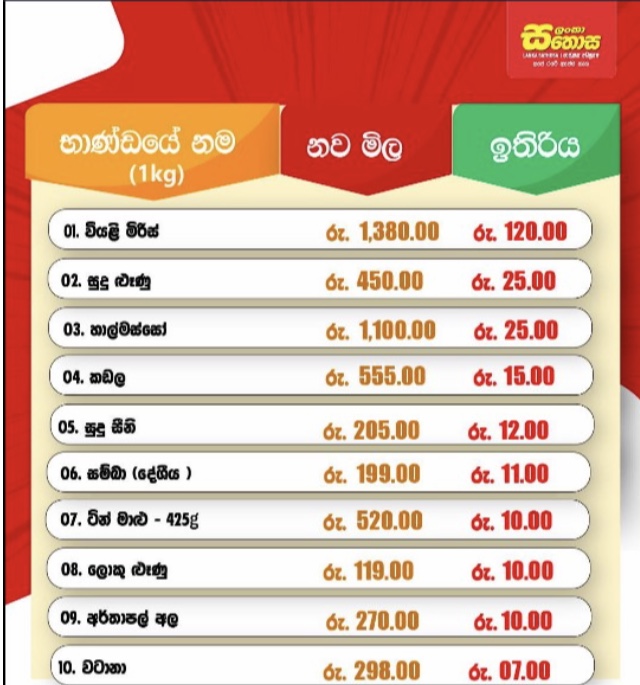 ඒ අනුව අර්තාපල්, ලොකු ළූණු, දේශීය සම්බා, වියළි මිරිස්, ටින් මාළු ඇතුළු භාණ්ඩ කිහිපයක මිල මෙලෙස අඩුකර ඇති බවයි සඳහන් වන්නේ.